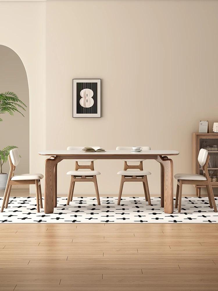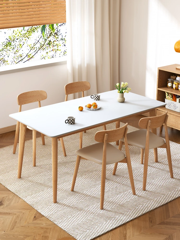 北欧スタイルの無垢材と岩板を使用した、モダンでシンプルな軽奢華長方形ダイニングテーブル。ホワイトアッシュの温もりを感じる小型家庭向け、食事を楽しむための理想的な空間を演出します。