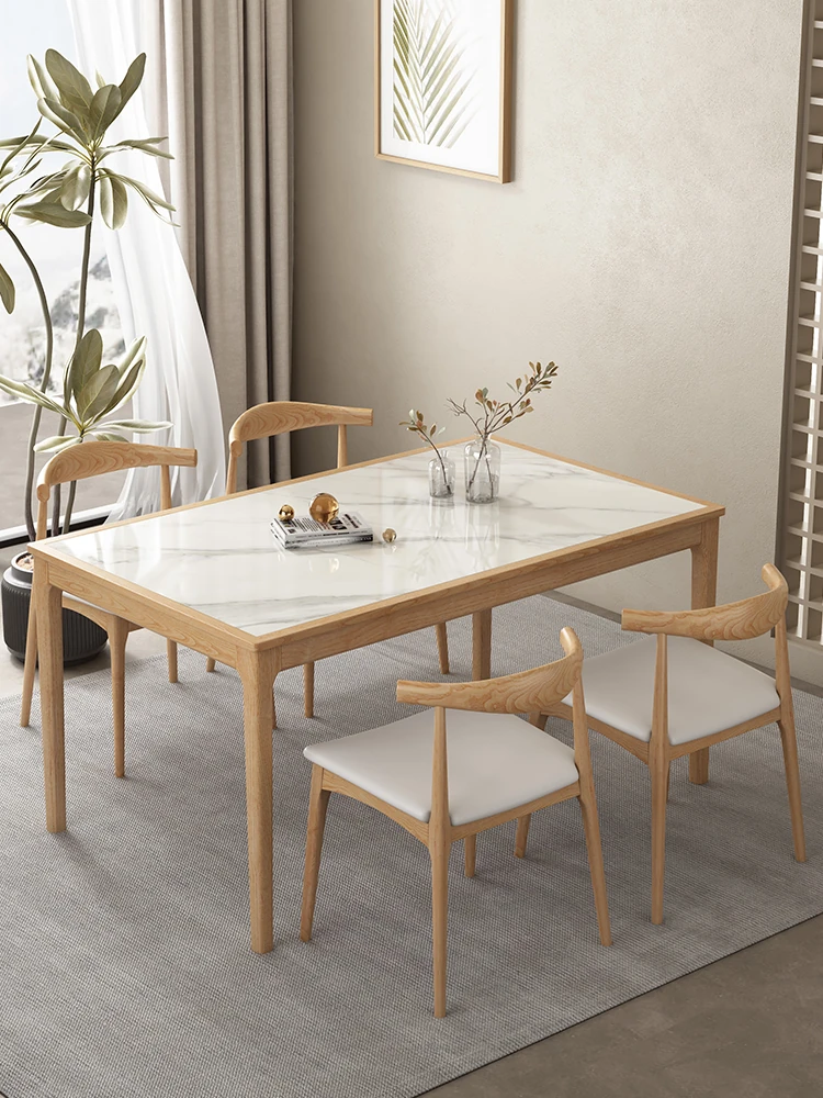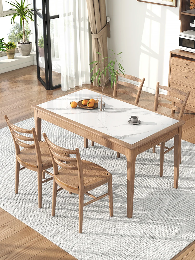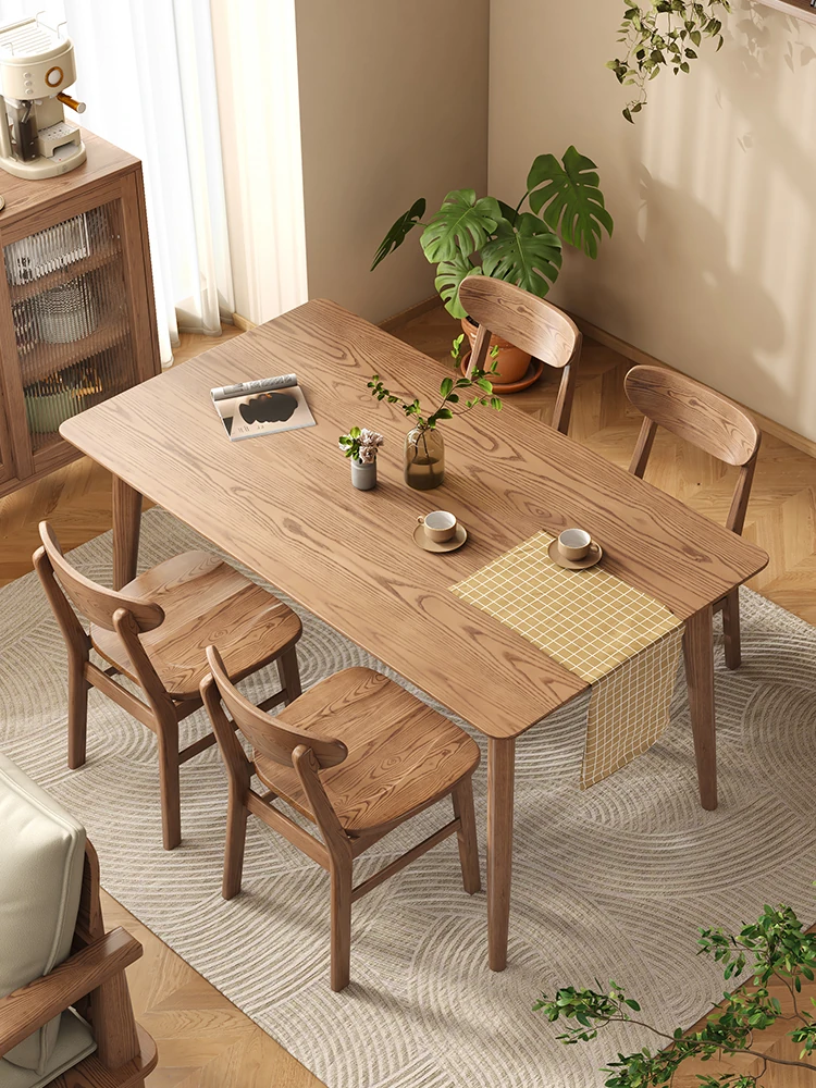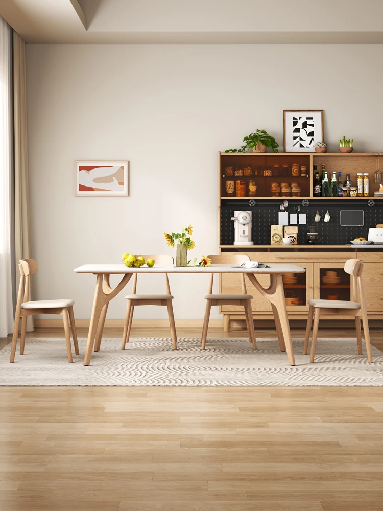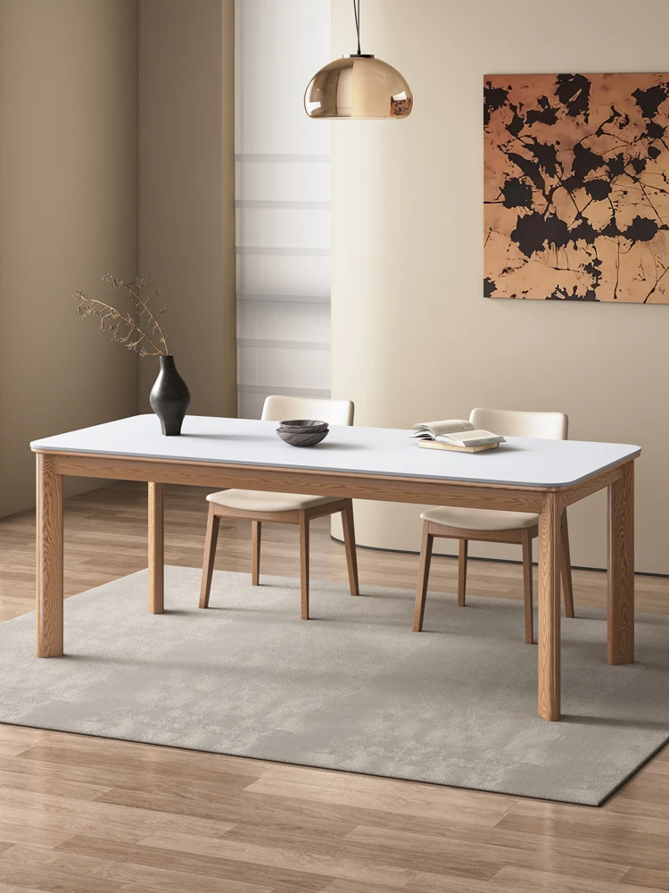 2025年新作!実木のロックボードダイニングテーブル - 小型住宅に最適なホワイトアッシュの天然木使用、モダンでシンプルなクリーム風デザイン。あなたの食卓を彩る一品です!