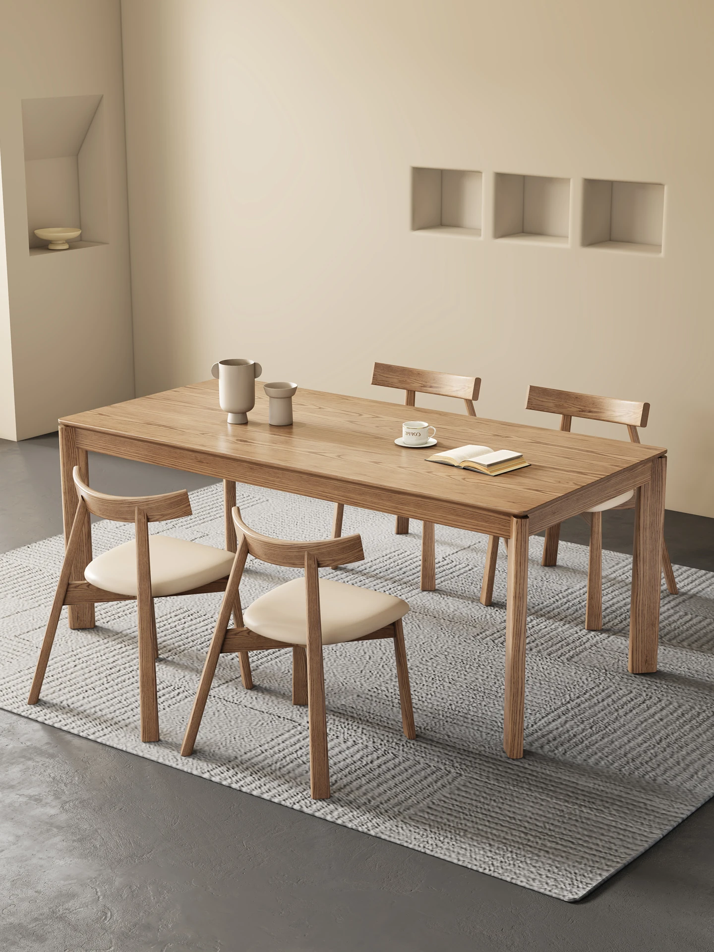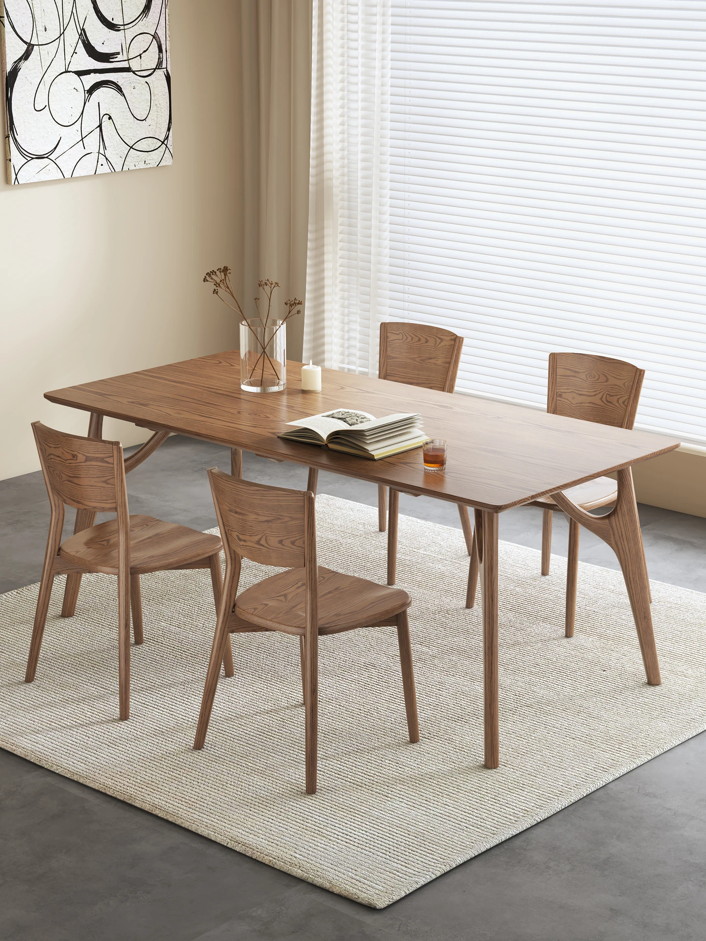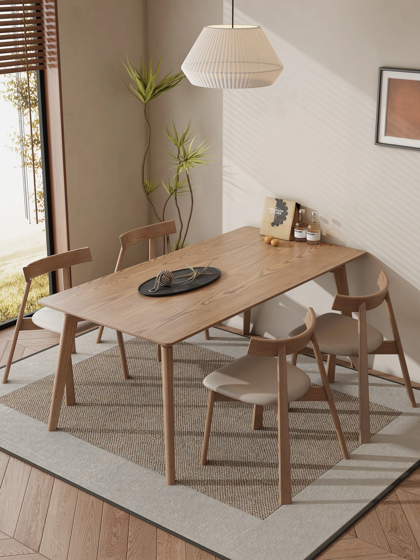 北欧スタイルの無垢材ダイニングテーブル - モダンでシンプル、小さなお部屋にぴったりな長方形の食卓。ホワイトアッシュの自然な風合いで、和の心を感じる食事の時間を演出します。