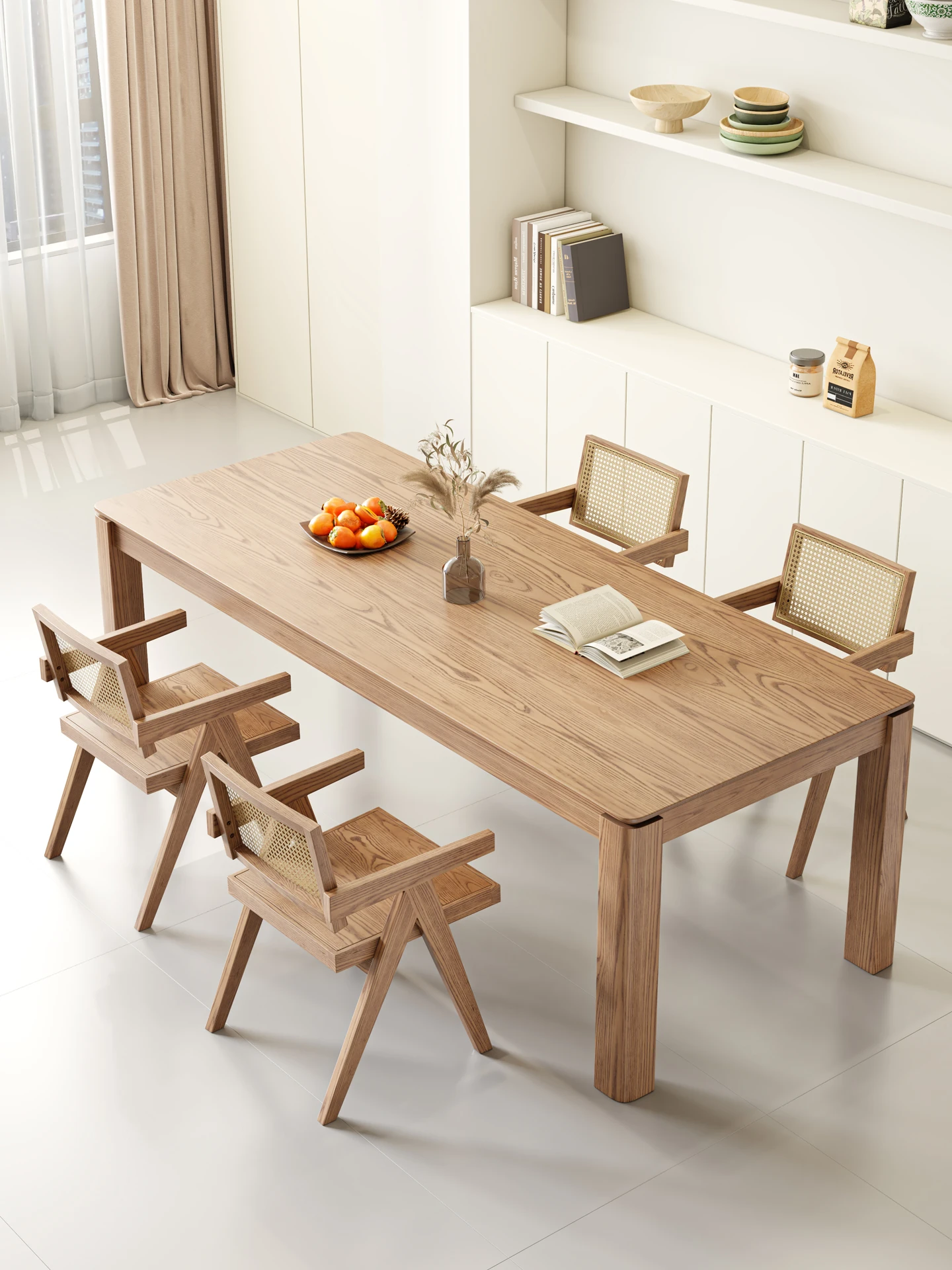 北欧スタイルの全実木ダイニングテーブルセット!小型住宅に最適な長方形の白アッシュ材テーブル。リビングや書斎でも使えるシンプルでエレガントなデザイン。収納も便利で、快適な食事空間を演出します。