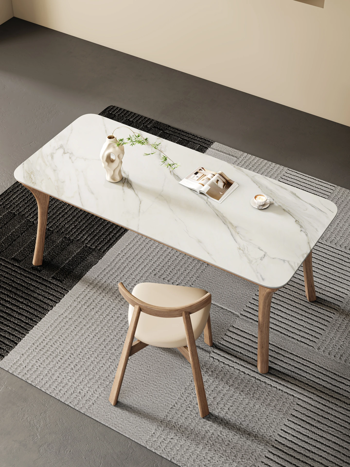 2025年新作!軽やかでスタイリッシュな無垢材のロックボードダイニングテーブル - ホワイトアッシュで仕上げた現代的なミニマリストデザイン、小さなスペースにもぴったりな贅沢感溢れる食卓。