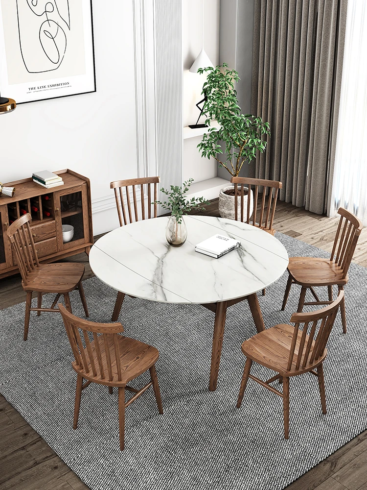 北欧スタイルの無垢材ロック板伸縮式丸テーブル - ホワイトアッシュ製のシンプルでモダンなデザイン、小スペースに最適な折りたたみ式ダイニングテーブル。