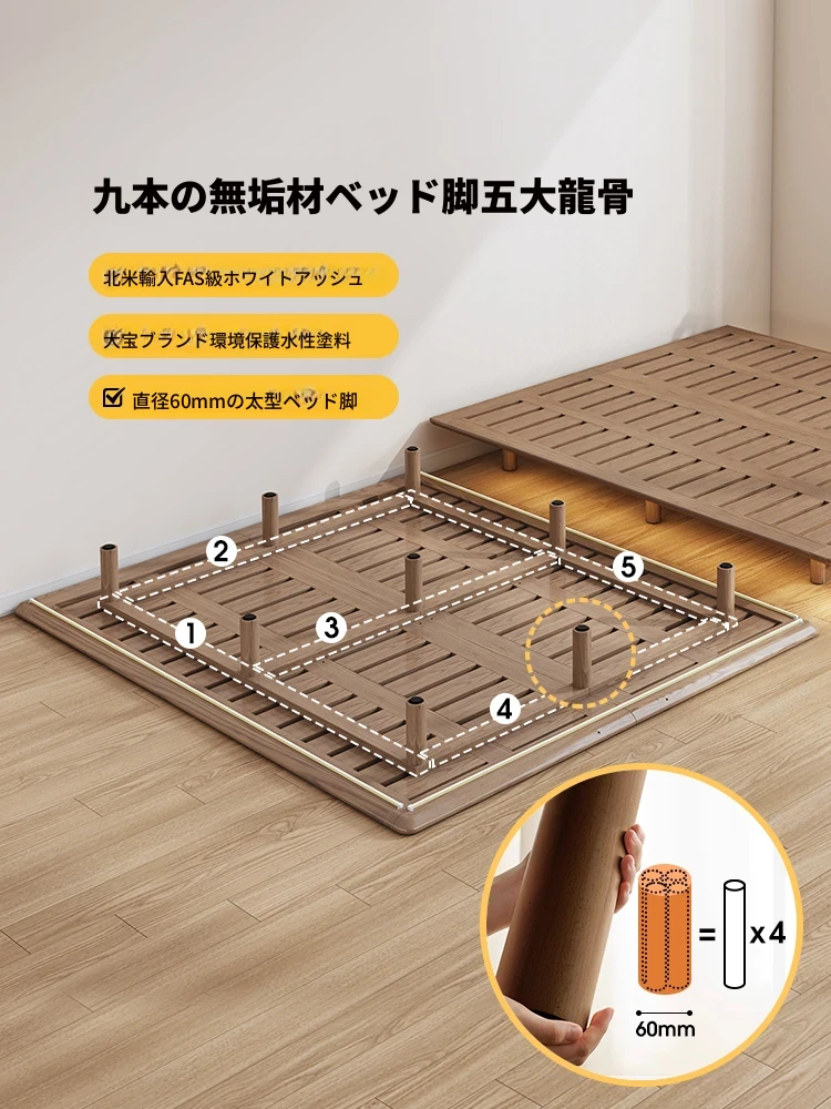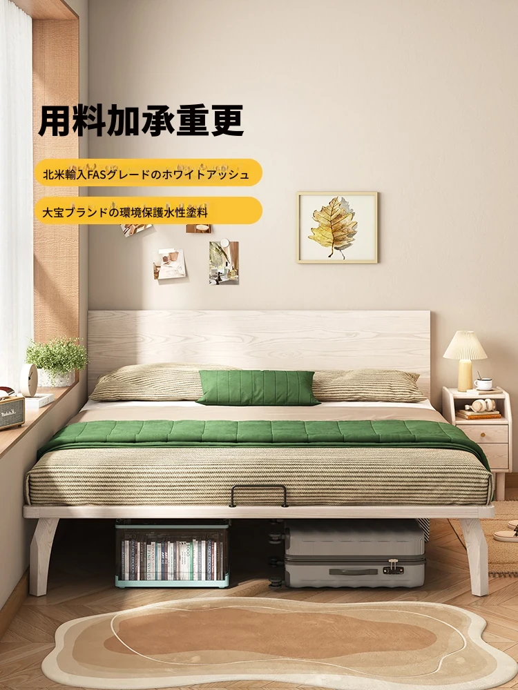 北欧スタイルの全実木ベッド - スペースを最大限に活用!薄型ヘッドボードで小さな部屋にもぴったり。白アリの木を使用した高脚デザインのダブルベッドで、主寝室をおしゃれに演出します。