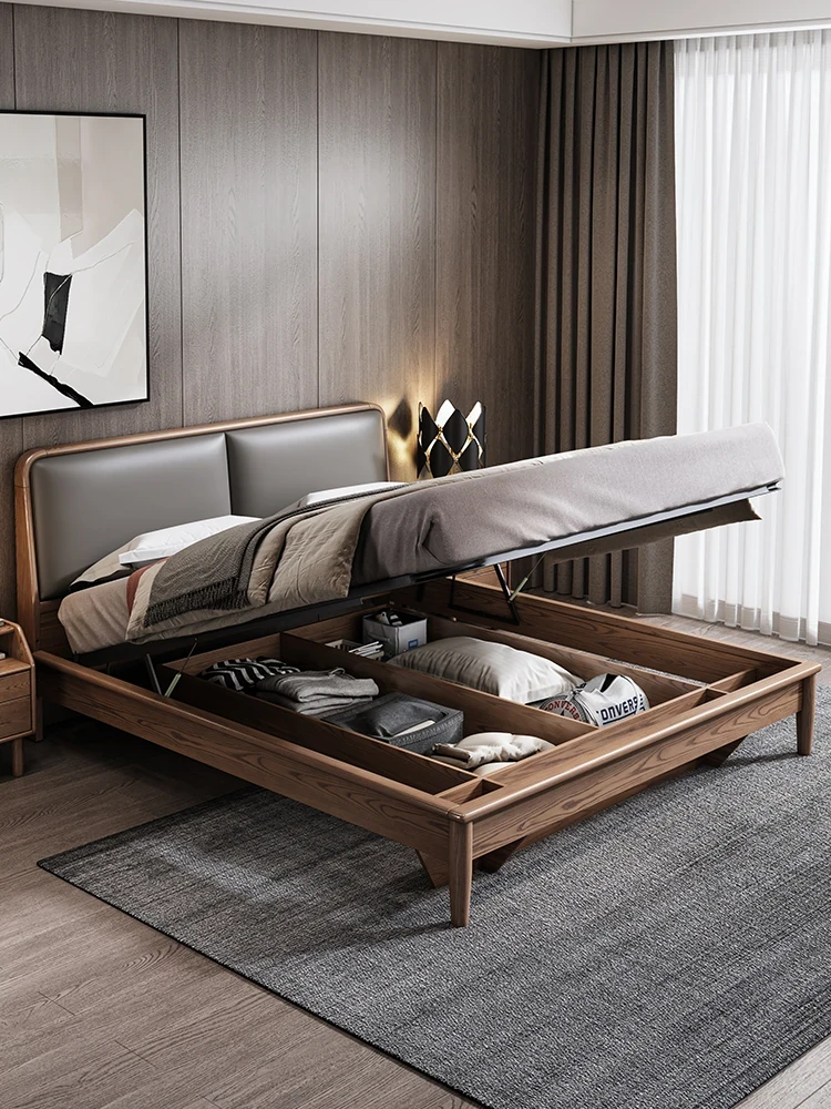 現代的ミニマリストデザインの本革フレーム木製ベッド - 高収納機能付き!ホワイトアッシュ材のダブルベッドで、主寝室に最適。スタイリッシュな空間を演出し、機能性と美しさを兼ね備えた一品です。