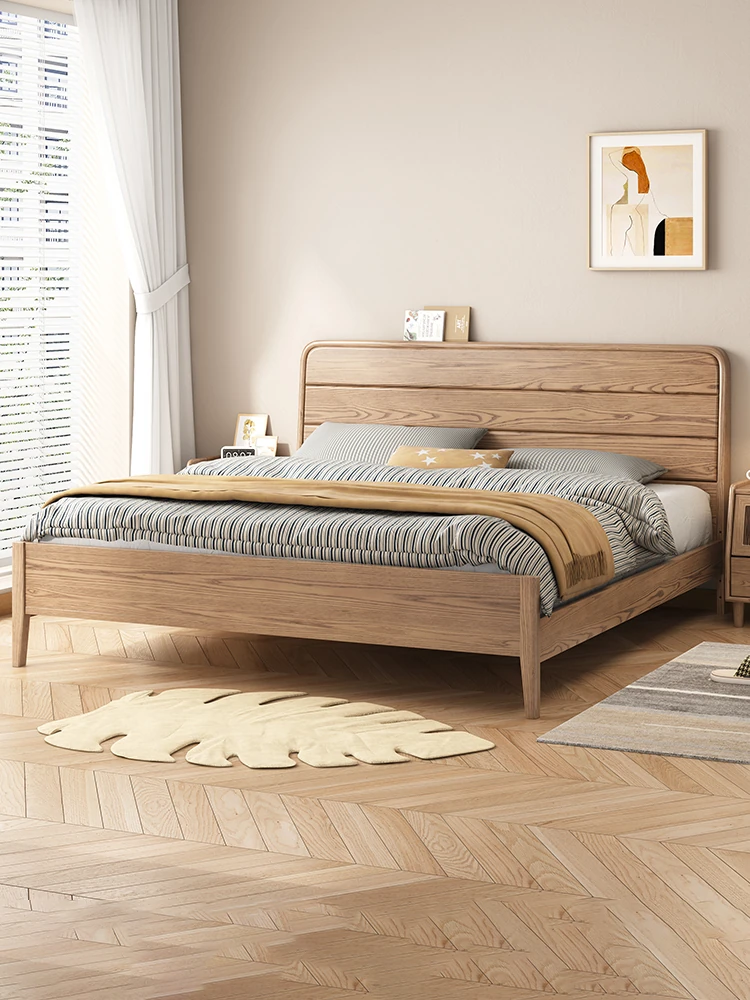 北欧スタイルの全木製ダブルベッド - 現代的でシンプルなデザイン、1.8mサイズのホワイトアッシュ材使用。小さな寝室にも最適な新中式の和風テイスト。心地よい眠りを提供する天然木の温もりを感じてください。