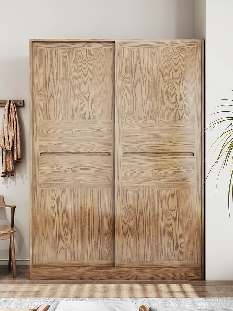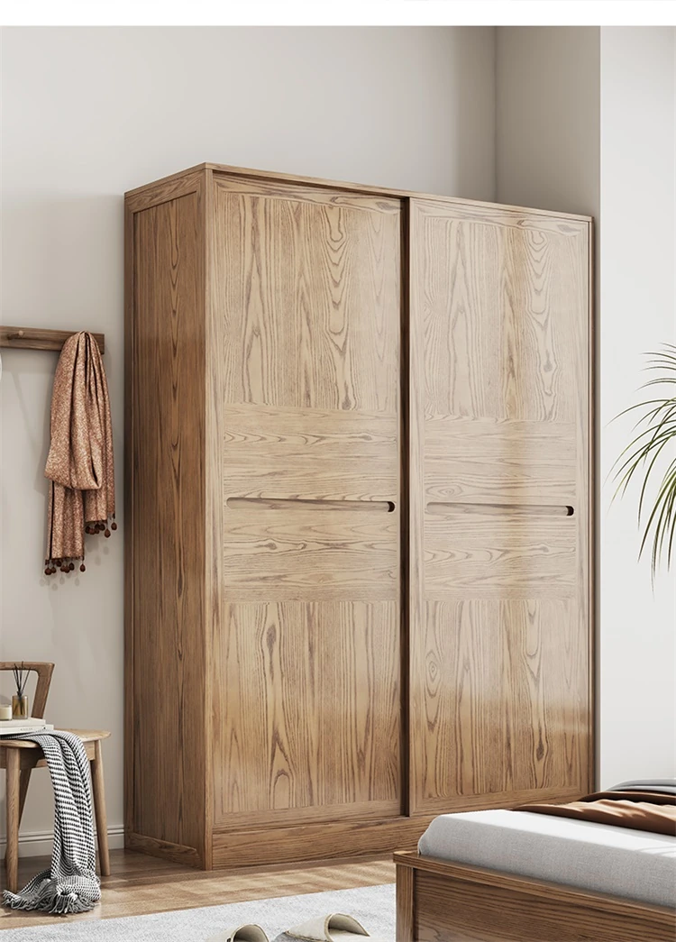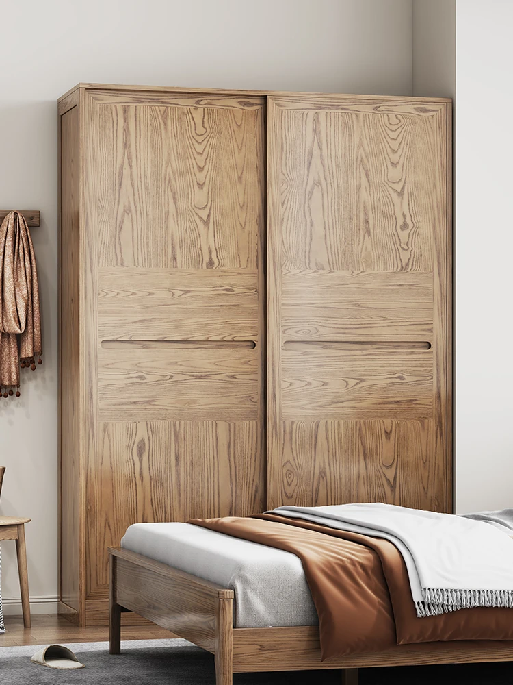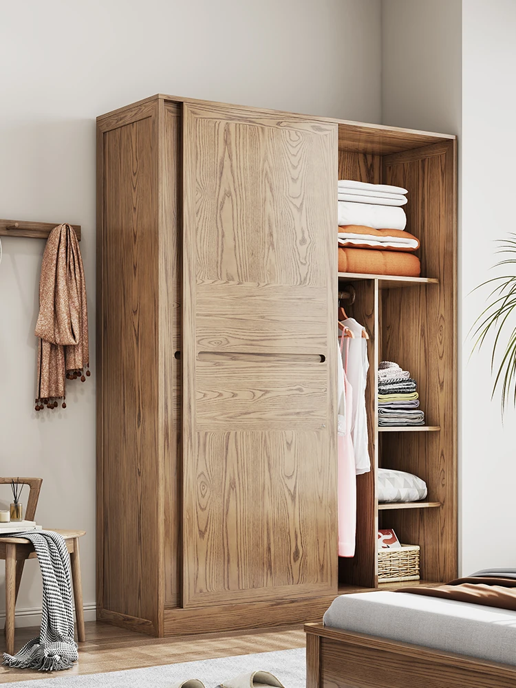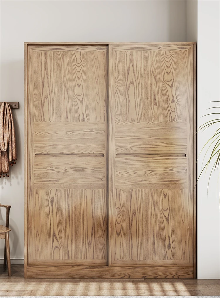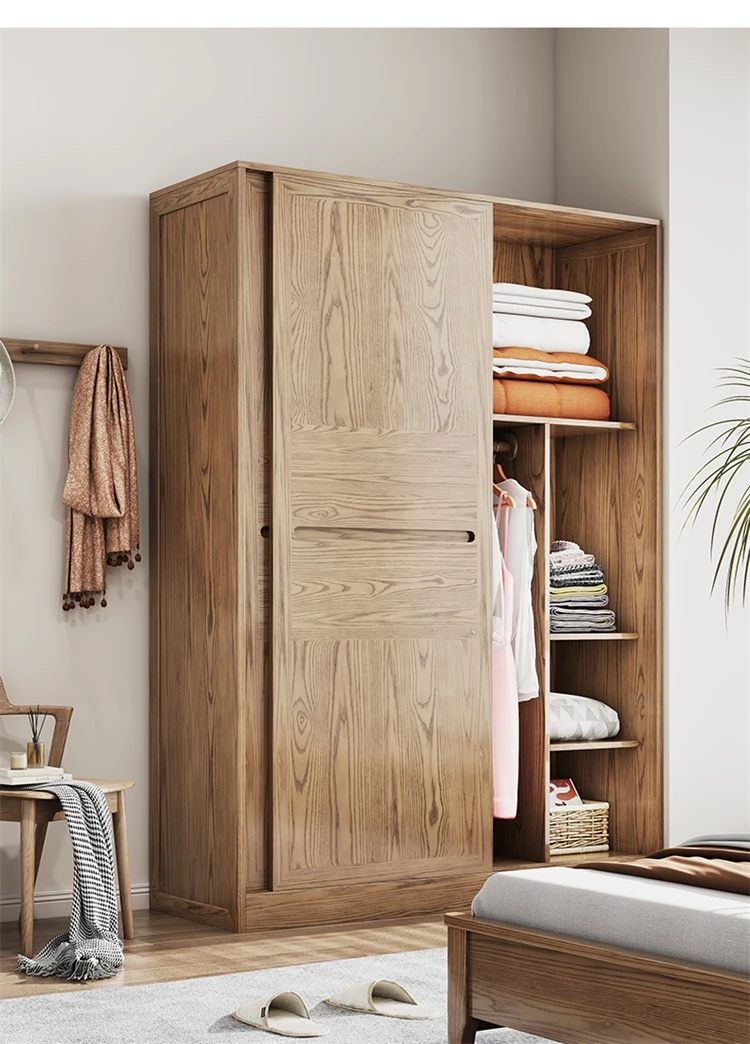 北欧風全実木クローゼット スライドドア付き 家庭用寝室にぴったりのフロアタイプ収納キャビネット モダンシンプルなデザイン ハンガーラック付き!おしゃれで機能的な収納を実現!
