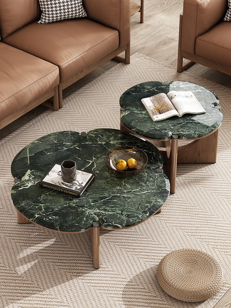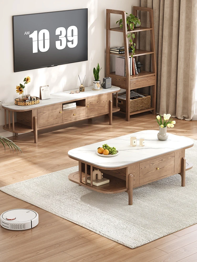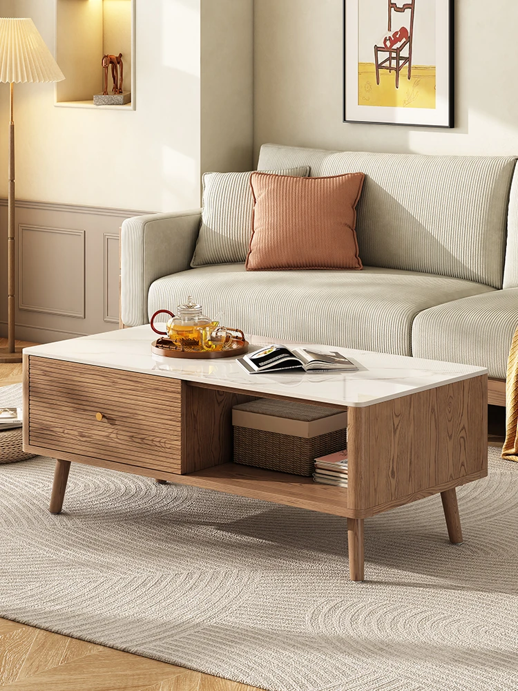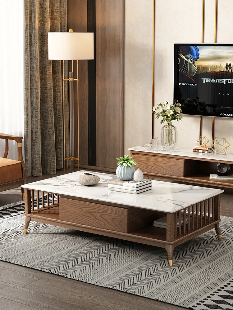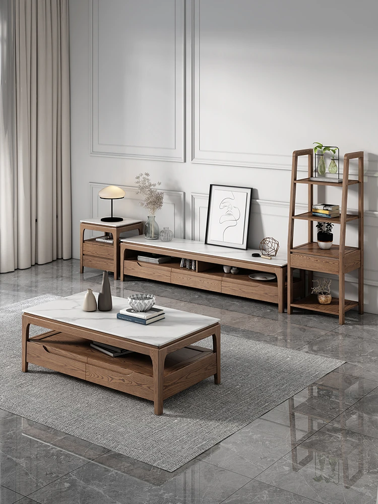 北欧スタイルの大理石と無垢材を使用したシンプルモダンなティーテーブルセット - ウォールナット色のコンパクトデザインで、リビングにぴったりの家具です!おしゃれで機能的な空間を演出します。