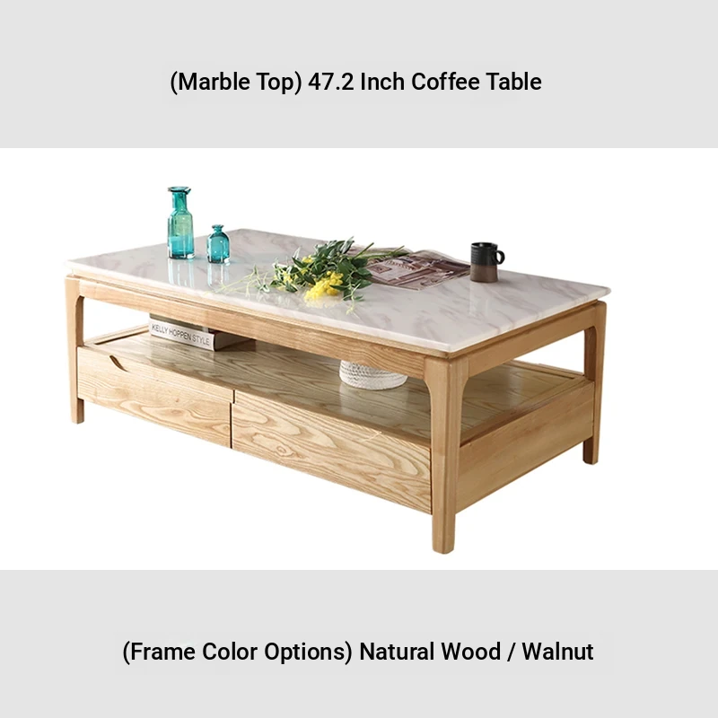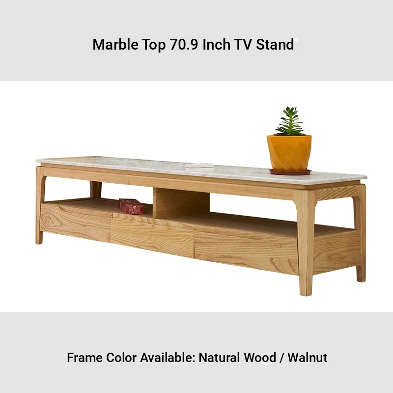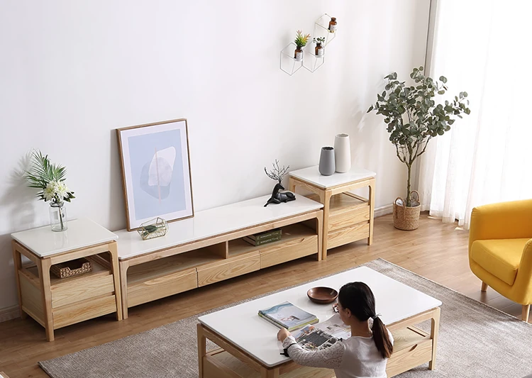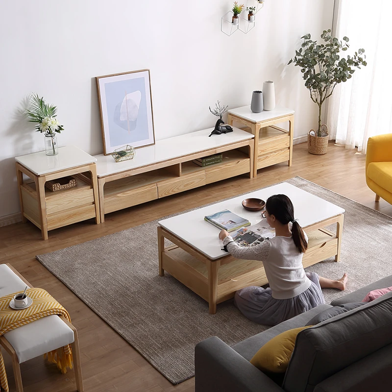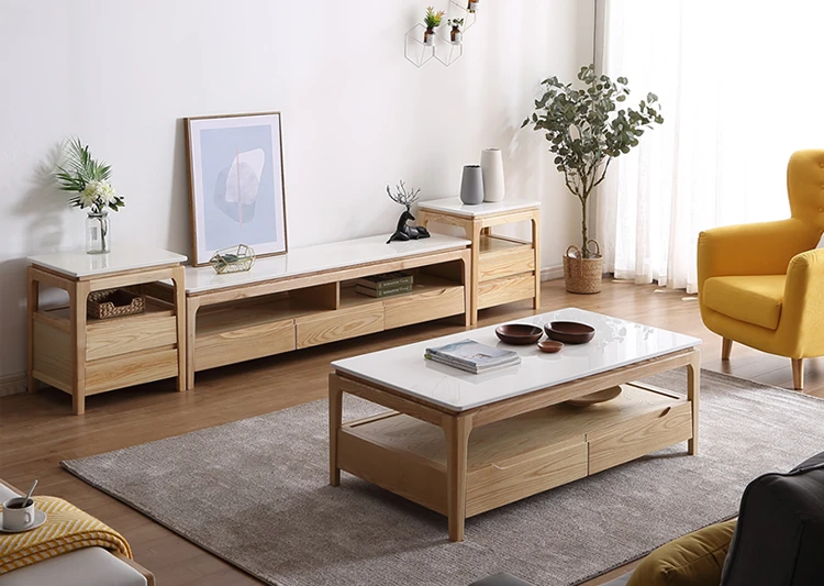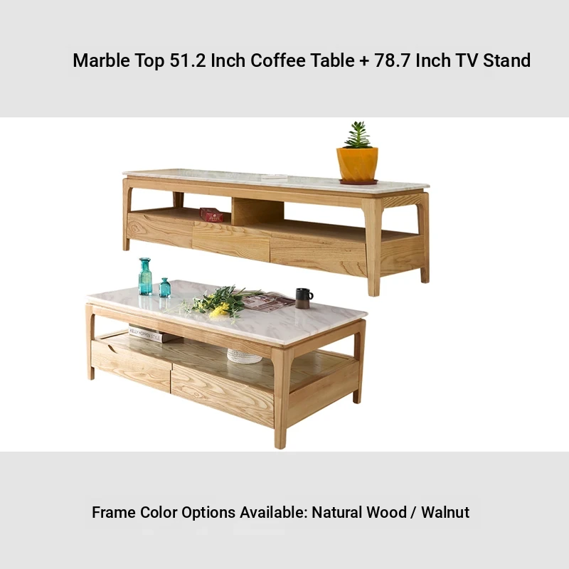 Scandinavian Style Marble Coffee Table and TV Stand Set - Minimalist Modern Design for Small Spaces, Featuring Natural Wood Color and Solid Rock Plate Coffee Table