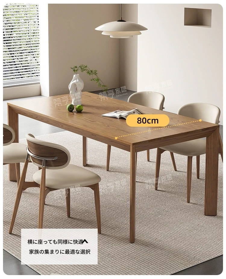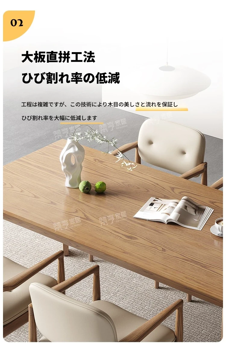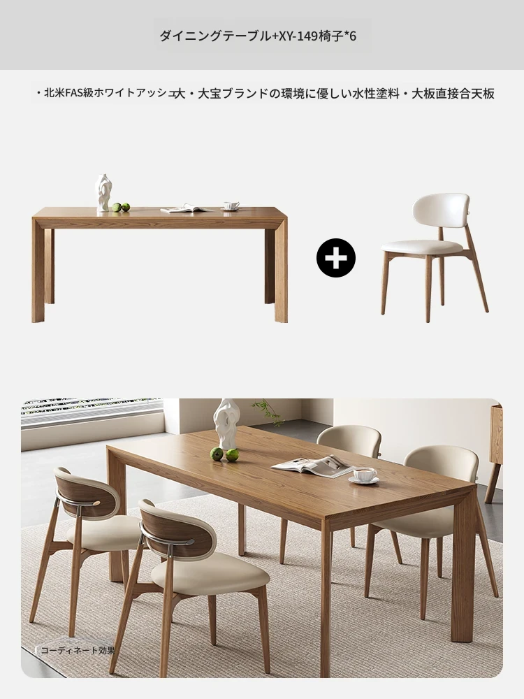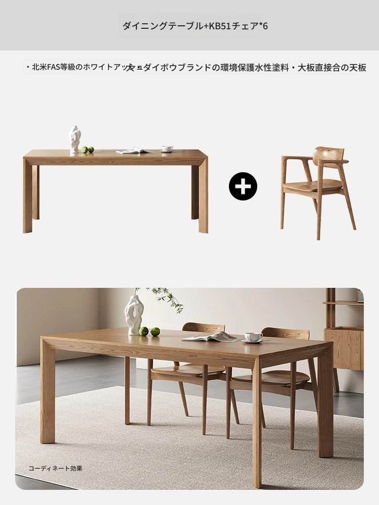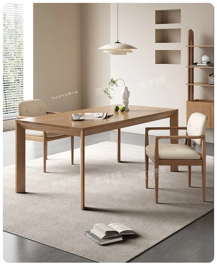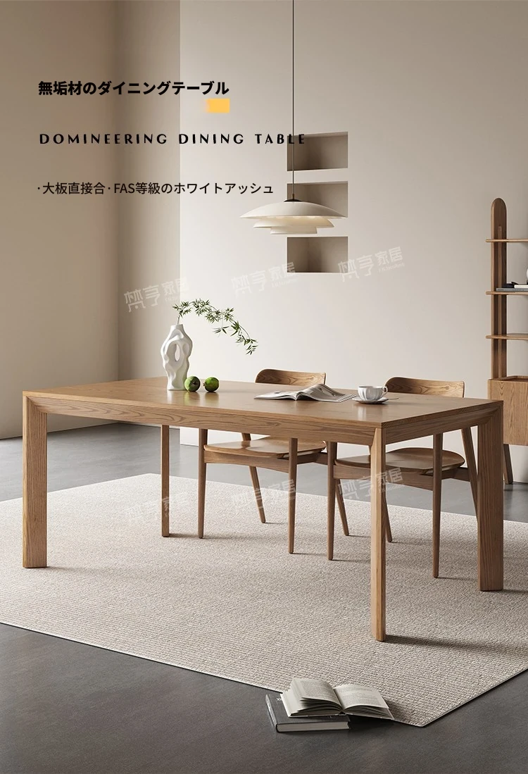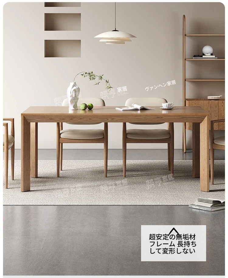 全実木の北欧スタイル長方形ダイニングテーブル - ホワイトアッシュ製、大型デスクとしても使える一体型デザイン!家庭用リビングにぴったりのスタイリッシュで機能的なテーブル。